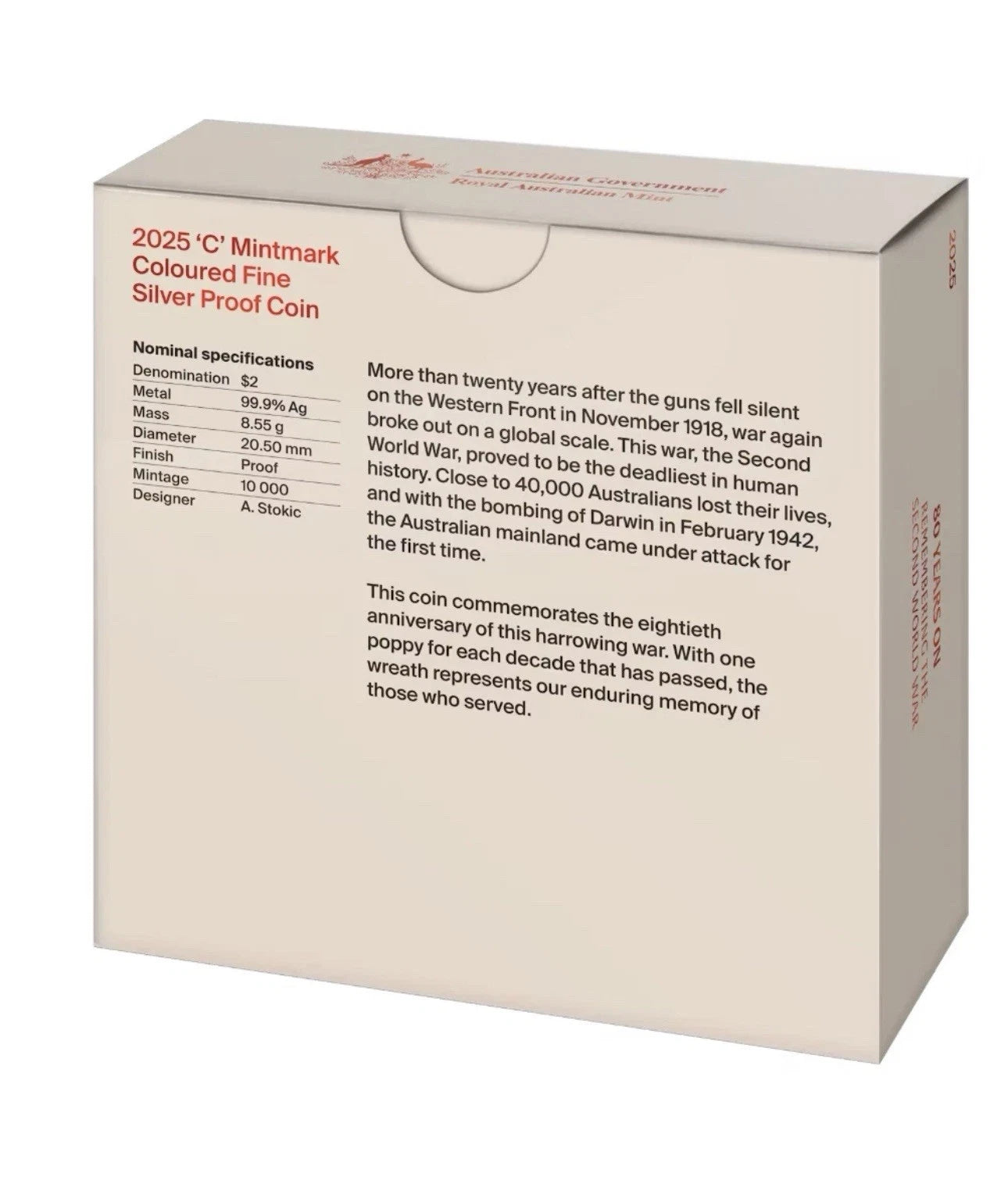 Crafted to commemorate the 80th Anniversary of the Second World War, the 2025 $2 ‘C’ Fine silver Proof Coin is a prestigious addition to any collection. Struck with meticulous care, this proof quality coin is composed of premium silver, sourced and crafted in Australia, reflecting the nation’s rich heritage and commitment to excellence in coinage.